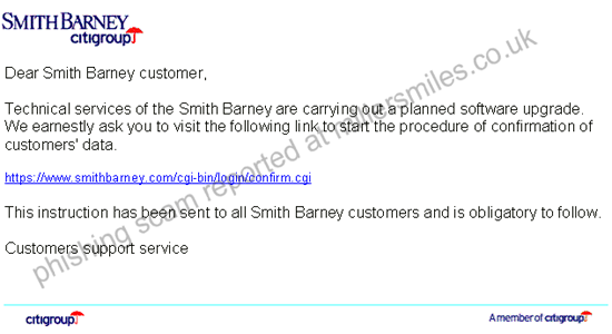 1. Email claims to be from Smith Barney asking you to confirm your account data by clicking on the link. You will be taken to a spoof login page where your details will be captured by the phishers.
