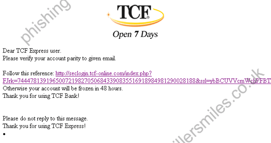 1. Email claims to be from TCF asking you to confirm your account data by clicking on the link. You will be taken to a spoof login page where your details will be captured by the phishers.