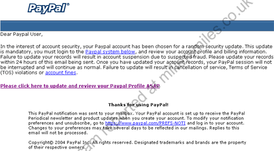 " Dear Paypal User, In the interest of account security, your Paypal account has been chosen for a random security update. "