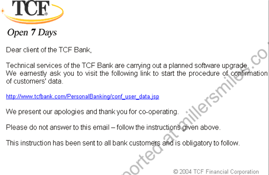 " Dear client of the TCF Bank, Technical services of the TCF Bank."