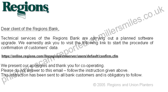 "Dear client of the Regions Bank, Technical services of the Regions Bank are carrying out a planned software upgrade... "