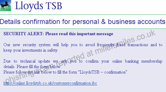 1. Email claims to be from Lloyds TSB asking you to confirm your account data by clicking on the link.