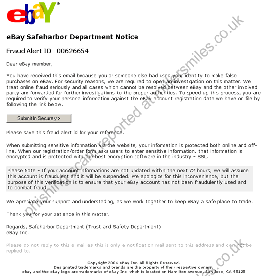 1. Email claims to be from eBay asking you to confirm your account data by clicking on the link. You will be taken to a spoof login page where your details will be captured by the phishers.