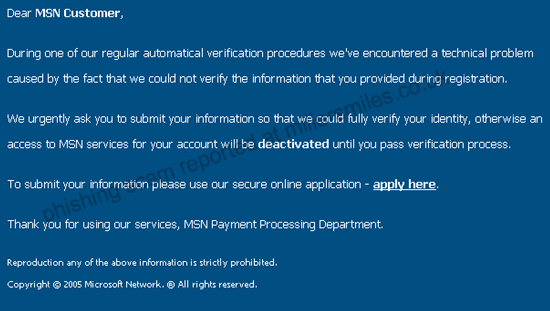 "Dear MSN customer, During one of our regular automatical verification procedures... "