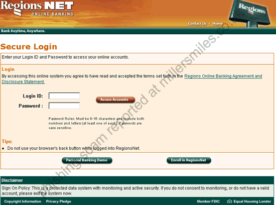 If you received this notice and you are not the authorized account holder, please be aware that it is in violation of Regions Bank policy to represent oneself as another Regions Bank user. Such action may also be in violation of local, national, and/or international law.Regions Bank is committed to assist law enforcement with any inquires related to attempts to misappropriate personal information with the intent to commit fraud or theft. Information will be provided at the request of law enforcement agencies to ensure that perpetrators are prosecuted to the fullest extent of the law.