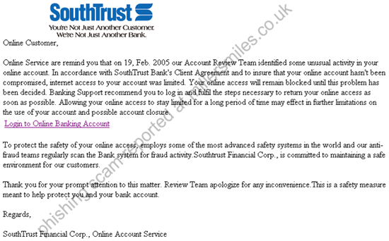 Online Service are remind you that on 19, Feb. 2005 our Account Review Team identified some unusual activity in your online account.