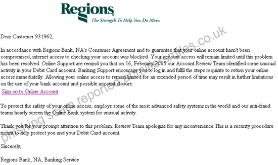 " In accordance with Regions Bank, NA's Consumer Agreement and to guarantee that your online account hasn't been compromised, internet access to checking your account was blocked.
