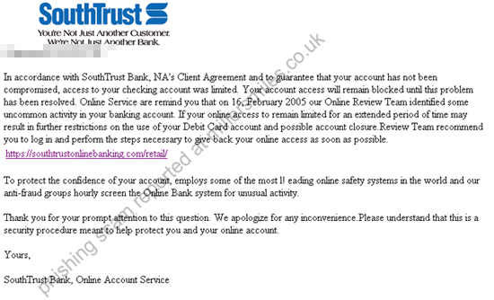 In accordance with SouthTrust Bank, NA's Client Agreement and to guarantee that your account has not been compromised, access to your checking account was limited.