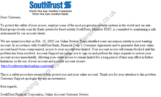 " To protect the safety of your access, employs some of the most progressive security systems in the world and our anti-fraud groups hourly scan the Bank system for fraud activity.SouthTrust, Member FDIC, is committed to maintaining a safe environment for our account clients. "