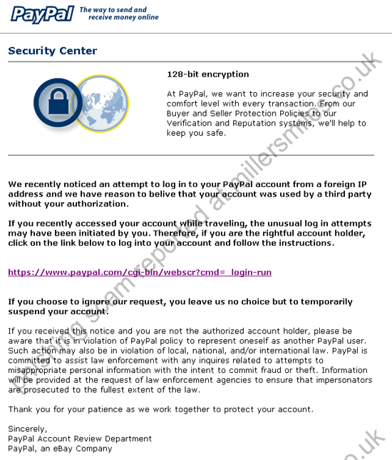 " We recently noticed an attempt to log in to your PayPal account from a foreign IP address and we have reason to belive that your account was used by a third party without your authorization."