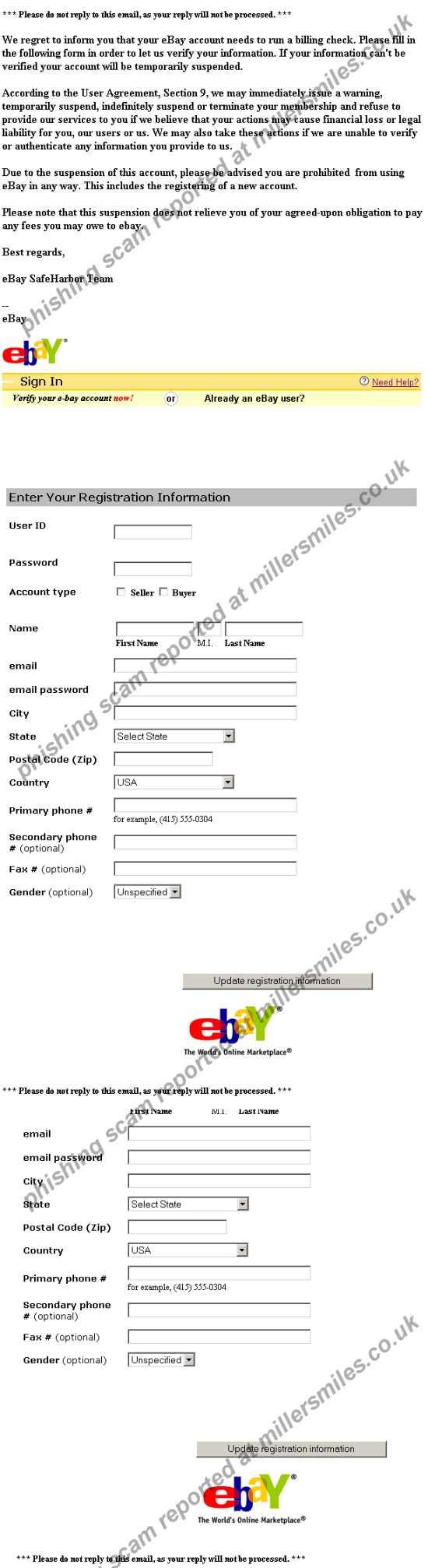 " We regret to inform you that your eBay account needs to run a billing check. Please fill in the following form in order to let us verify your information."...
