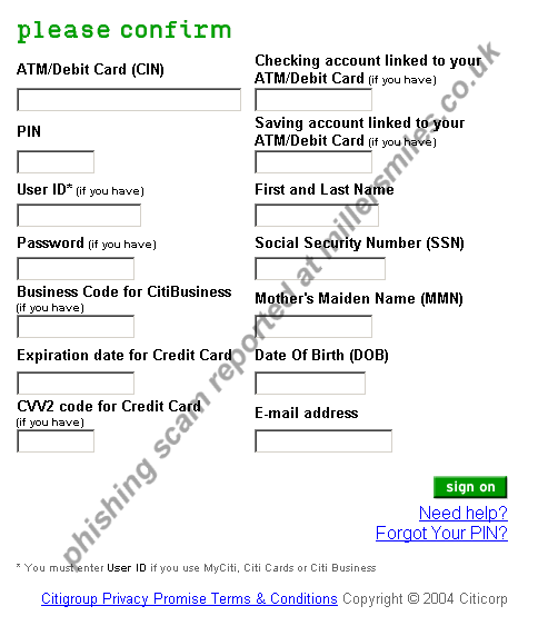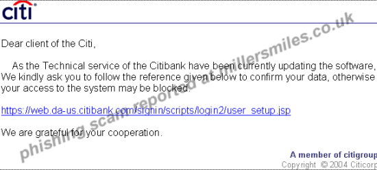 " Dear client of the Citi, As the Technical service of the Citibank have been currently updating the software..."...