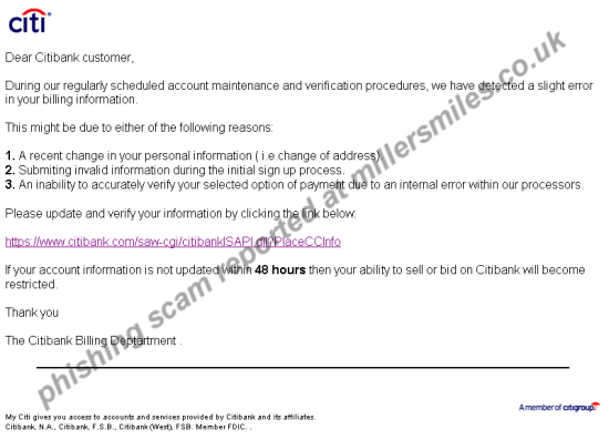 " Dear Citibank customer, During our regularly scheduled account maintenance and verification procedures, we have detected a slight error in your billing information."...