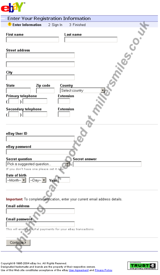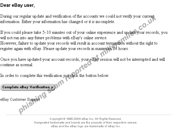 " Dear eBay user, During our regular update and verification of the accounts we could not verify your current information. Either your information has changed or it is incomplete."...