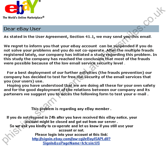 " Dear eBay User, As stated in the User Agreement, Section 41.1, we may send you this email. We regret to inform you that your eBay account can be suspended if you do not solve your problems and you do not co-operate."...
