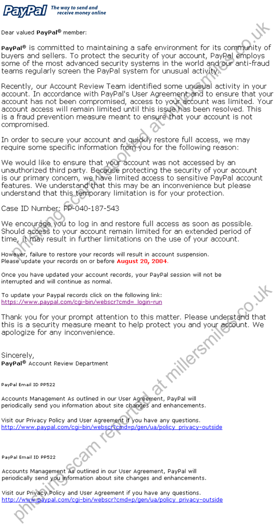 " Dear valued PayPal member: PayPal is commited to maintaining a safe enviroment for its community of buyers and sellers "...