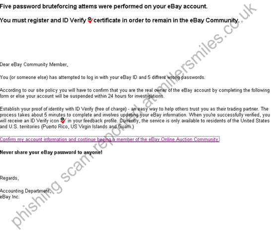 " Five password bruteforcing attems were performed on your eBay account. You must register and ID Verify certificate in order to remain in the eBay Community."...
