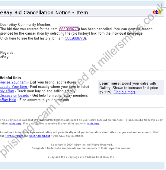 The bid that you entered for the item ( 3832080778 ) has been cancelled. You can view the reason provided for the cancellation by selecting the (bid history) link from the individual item page."...