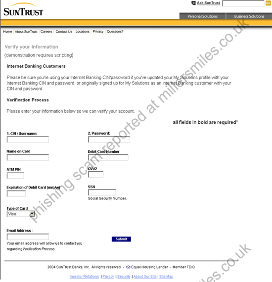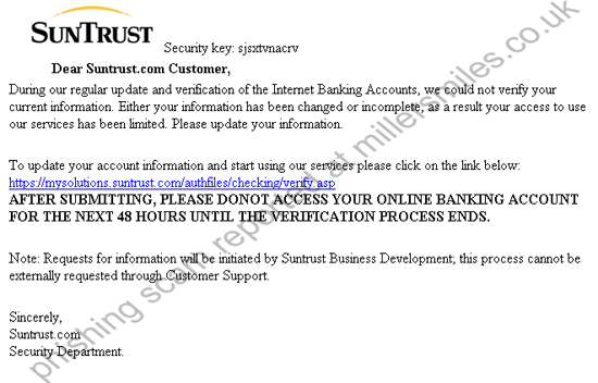 " Dear Suntrust.com Customer, During our regular update and verification of the Internet Banking Accounts, we could not verify your current information."...
