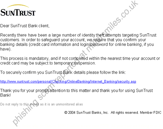 " Dear SunTrustclient, Recently there have been a large number of identity theft attempts targeting Suntrust customers"...