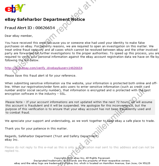 You have received this email because you or someone else had used your identity to make false purchases on eBay..."...