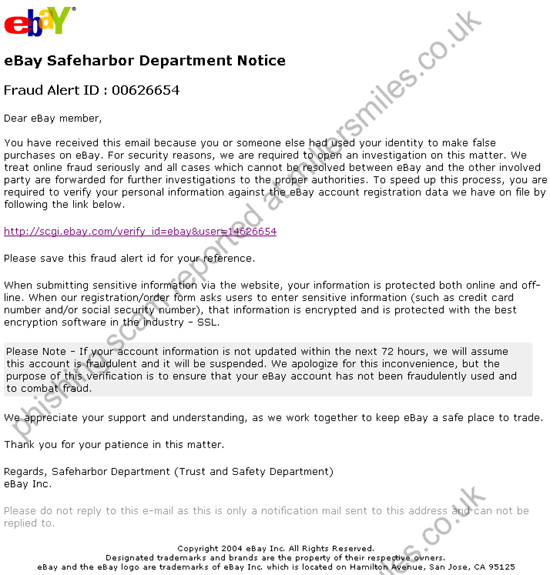 You have received this email because you or someone else had used your identity to make false purchases on eBay. "...