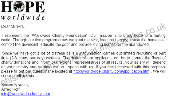 " I represent the "Worldwide Charity Foundation". Our mission is to bring hope to a hurting world "...