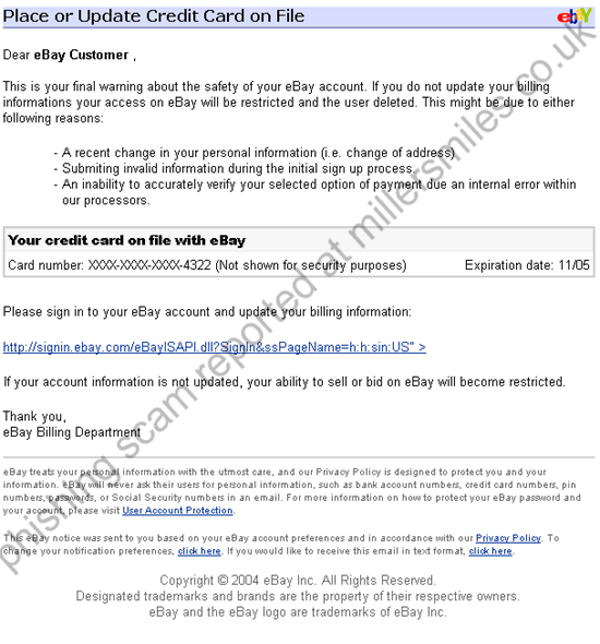 This is your final warning about the safety of your eBay account. If you do not update your billing informations your access on eBay will be restricted and the user deleted. This might be due to either following reasons: