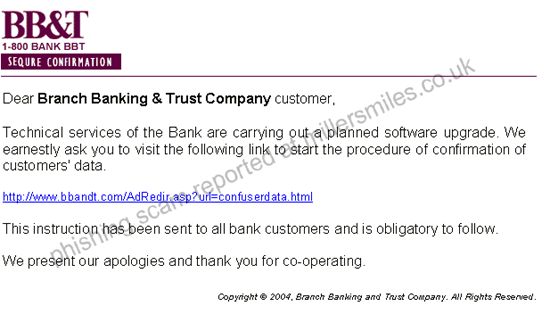 " Dear Branch Banking & Trust Company customer, Technical services of the Bank are carrying out a planned software upgrade "...
