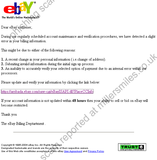 "Dear eBay customer, During our regularly scheduled account maintenance and verification procedures, we have detected a slight error in your billing information. "...
