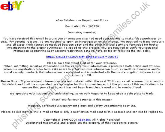 You have received this email because you or someone else had used your identity to make false purchases on eBay. "...