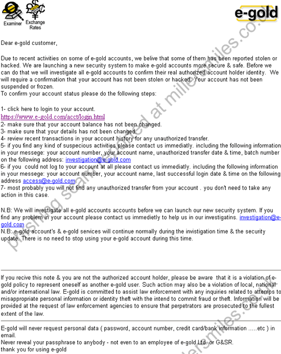 " Dear e-gold customer, Due to recent activities on some of e-gold accounts, we belive that some of them has been reported stolen or hacked."