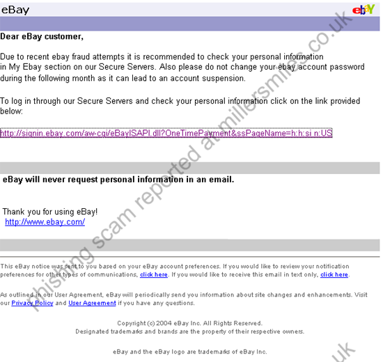 " Dear eBay customer, Due to recent ebay fraud attempts it is recommended to check your personal information in My Ebay section on our Secure Servers. "