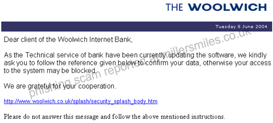 "Dear client of the Woolwich Internet Bank, As the technical service of the bank have been recently updating the software..."