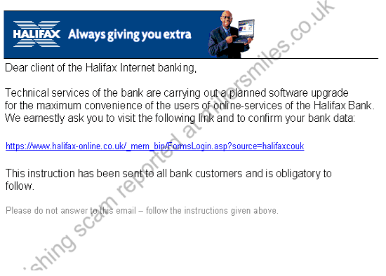 " Dear client of the Halifax Internet banking, Technical services of the bank are carrying out a planned software upgrade... "