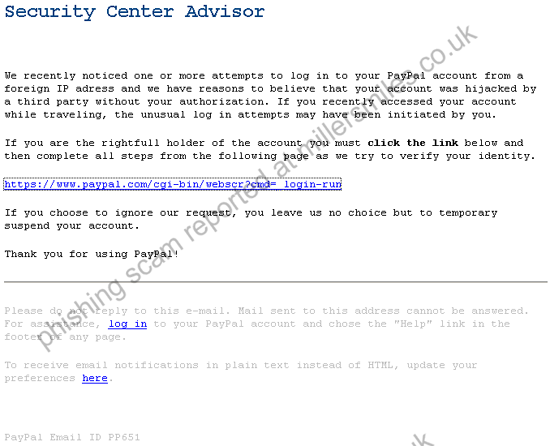 " We recently noticed one or more attempts to log in to your PayPal account from a foreign IP adress and we have reasons to believe that your account was hijacked by a third party without your authorization. "