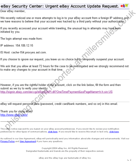 " We recently noticed one or more attempts to log in to your eBay account from a foreign IP address and we have reasons to believe that your account was hacked by a third party without your authorization."