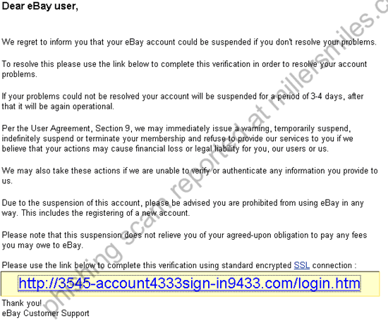 "We regret to inform you that your eBay account could be suspended if you don't resolve your problems. To resolve this please use the link below to complete this verification in order to resolve your account problems. "