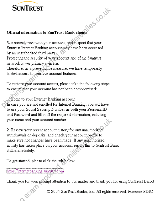 Recently there have been a large number of identity theft attempts targeting SunTrust Customers."