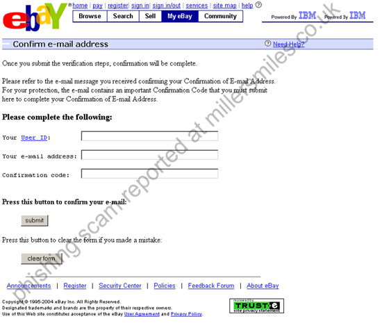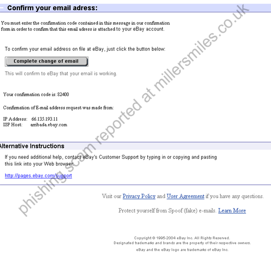 " You must enter the confirmation code contained in this message in our confirmation form in order to confirm that this email adress is attached to your eBay account. "