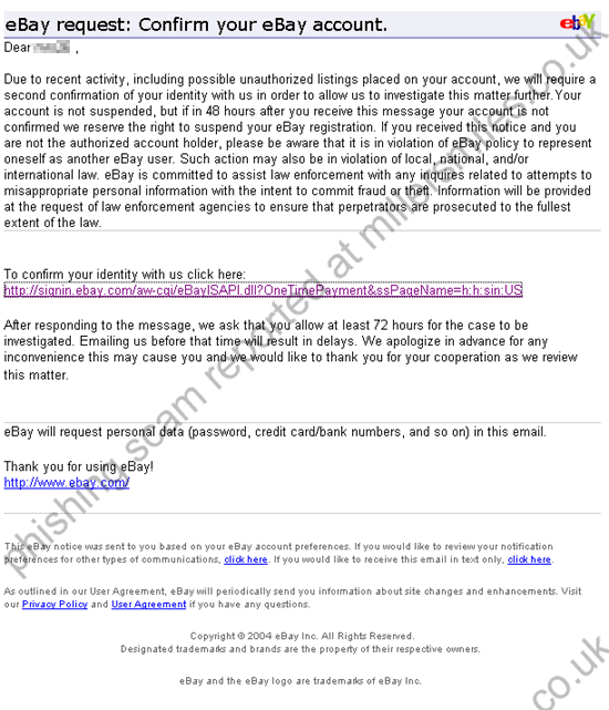 " Due to recent activity, including possible unauthorized listings placed on your account, we will require a second confirmation of your identity with us in order to allow us to investigate this matter further."