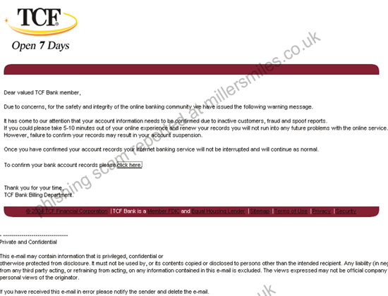 " Dear valued TCF Bank member, Due to concerns, for the safety and integrity of the online banking community we have issued the following warning message."