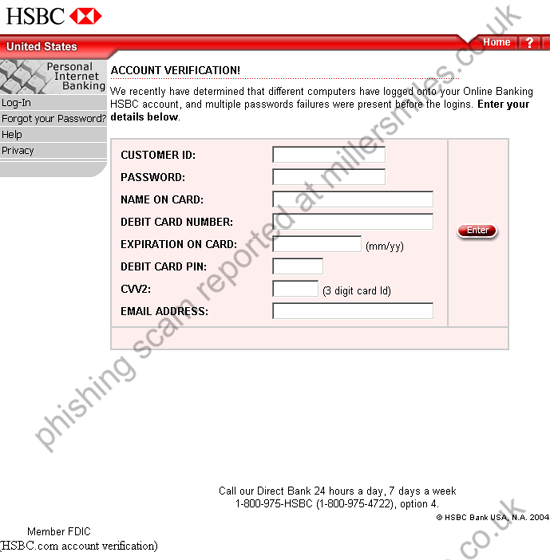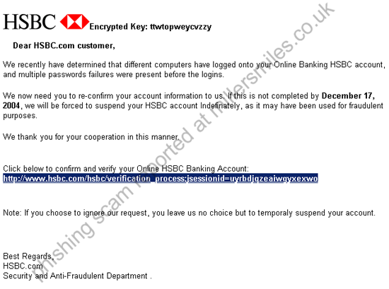 " We recently have determined that different computers have logged onto your Online Banking HSBC account, and multiple passwords failures were present before the logins. "