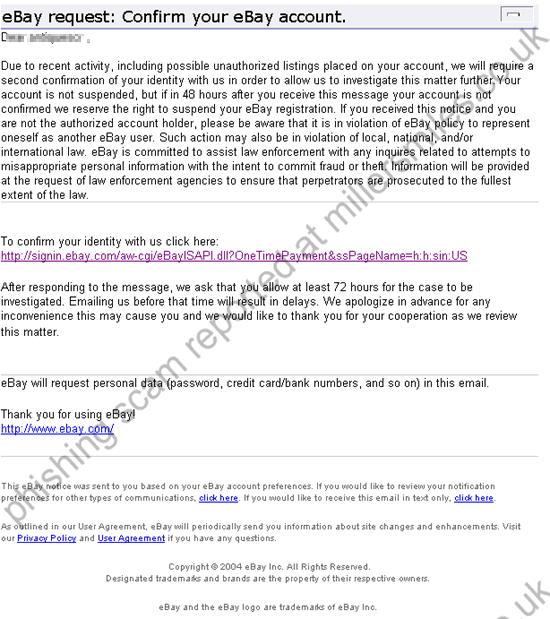 Due to recent activity, including possible unauthorized listings placed on your account, we will require a second confirmation of your identity with us in order to allow us to investigate this matter further. "