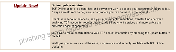 " Online update required TCF Online update is a safe, fast and convenient way to access your accounts 24 hours a day, 7 days a week from home, work, or anywhere you can connect to the Internet."