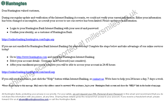 "Dear Huntington valued customer, During our regular update and verification of the Internet Banking Accounts, we could not verify your current information. "