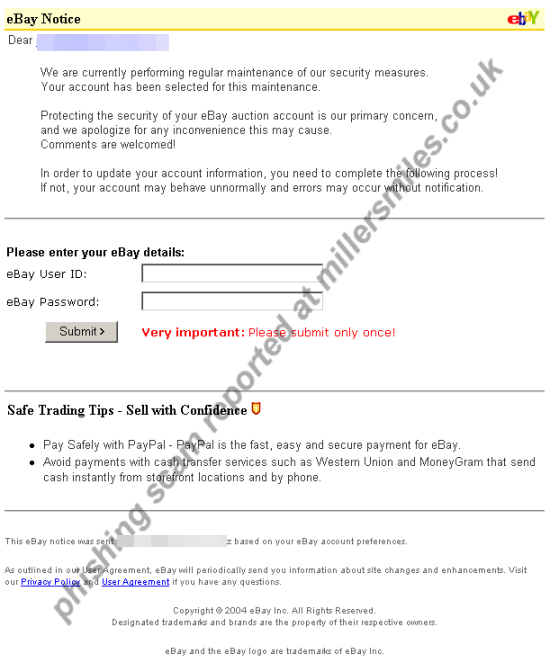 This week we'll take a look at the scamming technique most commonly known as "phishing", which is becoming a growing problem on the internet. In 2004 alone, there has been a 40% rise in the number of recorded attacks, and the situation is only likely to get worse. The term "phishing", comes, unsurprisingly, from the word fishing, and follows a very similar approach. Fraudsters and scammers , (the "fishermen"), send out large quantities of emails, (the "bait"), to mostly random address across the internet. These emails appear to be from a variety of banks, financial services and sites like eBay, AOL and PayPal, all asking the victim to enter their account and/or credit card details, for a variety of reasons, from supposed ‘problems' with computer systems loosing account details, through to the more genuinely helpful looking reasons such as checking that a recent ‘credit transaction' was not unauthorized. Although only a small proportion of people (about 5%) will actually respond to phishing emails, for the scammer this is still a very large return for a minimum of risk. It is not currently illegal to send a phishing email; a crime is only commited if the scammer actually obtains the details he is after.