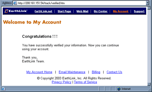 | We have informed Earthlink of this scam - particularly because we found no warning to their users on their site (perhaps they were unaware of its existance?) That being the case, this email has so far had 4 full days to spend in inboxes with the hope of collecting whatever data that unsuspecting users may provide. See the images and report (below) for more ..... image is 80% of actual
